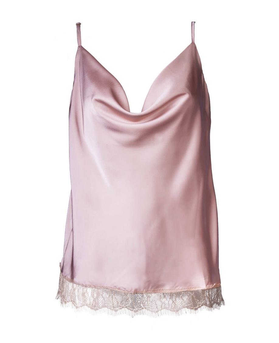 Top Luna cu dantelă Nude este un top din satin, croit pe bie, destinat purtării în casă, care poate fi folosit atât ca pijama din mătase, cât și ca top fashion. Realizat din mătase, viscoză, poliester reciclat și poliamidă, are o textură moale și fină, iar decolteul tip cowlneck îi oferă un aspect fluid și elegant.